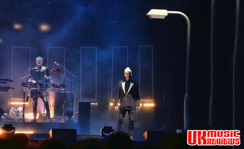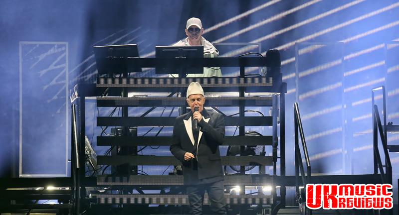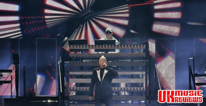 The crowd roared as the duo appeared on stage with mesmerising laser lights behind them wearing chrome face masks and with Neil Tennant standing under a lamp post and Chris Lowe soon donning his trademark cap behind the keyboards, they opened with their 1986 hit Surburbia before going into Can You Forgive Her? and Opportunities (Let’s Make Lots Of Money) which immediately had the crowd on their feet.