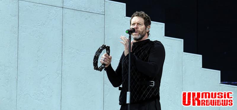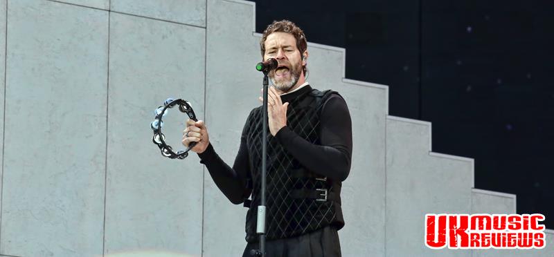 What had looked and acted as a lighting rig, turned upside down and revealed itself as a walkway, as the trio glimmered and shimmered their way to the B stage whilst singing Greatest Day, These Days and Time And Time Again. They returned to the main stage funky dancing to Relight My Fire, the Dan Hartman disco classic they released all those years ago, as elements of fire and water spewed and erupted from the stage.