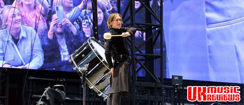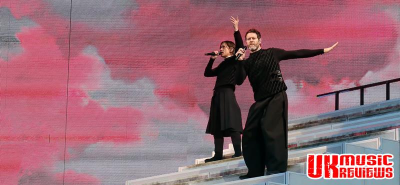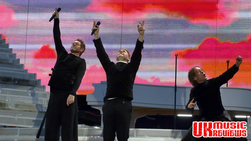 What had looked and acted as a lighting rig, turned upside down and revealed itself as a walkway, as the trio glimmered and shimmered their way to the B stage whilst singing Greatest Day, These Days and Time And Time Again. They returned to the main stage funky dancing to Relight My Fire, the Dan Hartman disco classic they released all those years ago, as elements of fire and water spewed and erupted from the stage.