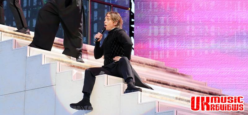 Past tours have delivered huge spectacles such as the acrobatic Circus with its mechanical elephant, and this tour proved to be another extravaganza of song, dance and stagecraft. Spectacular would be too modest a word to describe the set design. The centrepiece was the giant retro afore mentioned TV that split into two to form symmetrical staircases which evoked the elegance of a classic Fred Astaire and Ginger Rogers dance number.